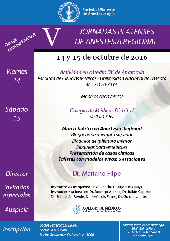 Sociedad Platense de Anestesiología > Secciones > Secretaría Científica > V Jornadas Platenses de Anestesia Regional